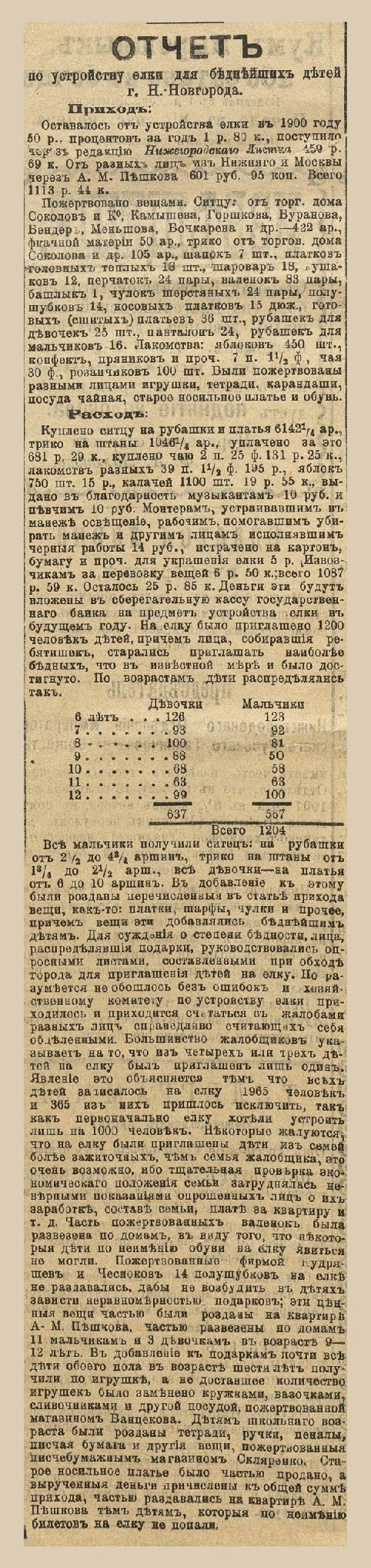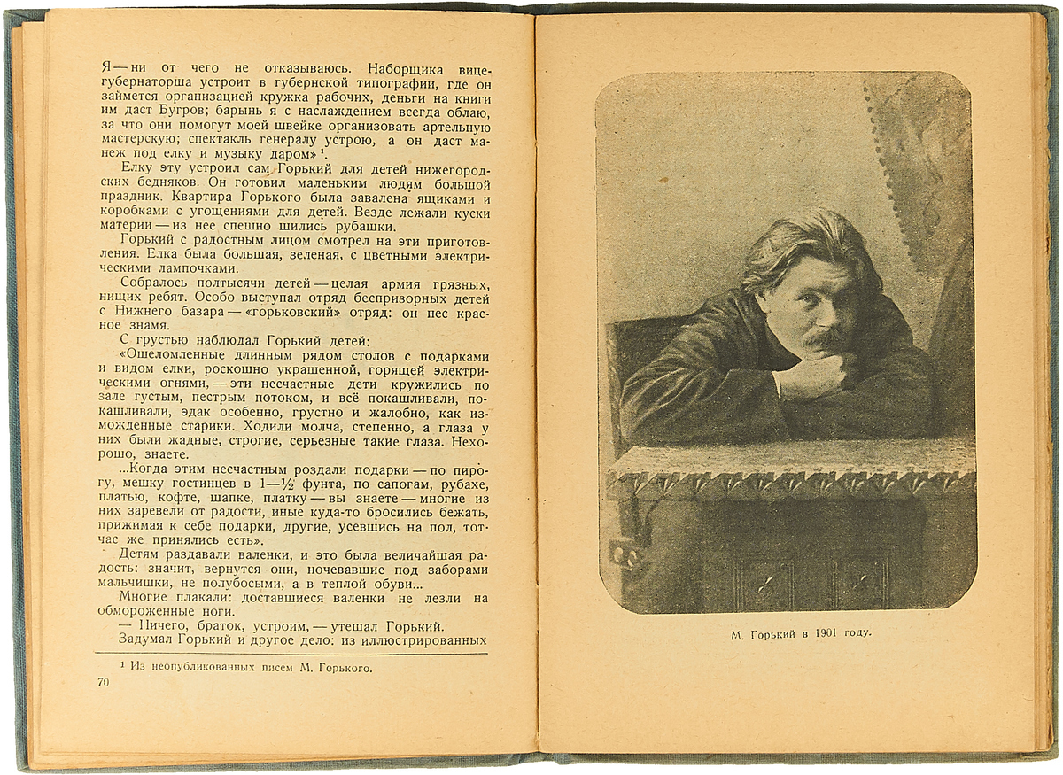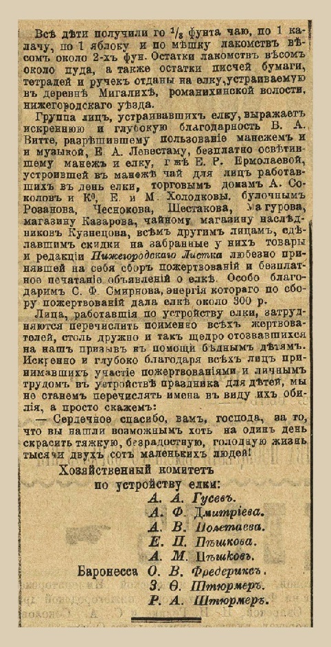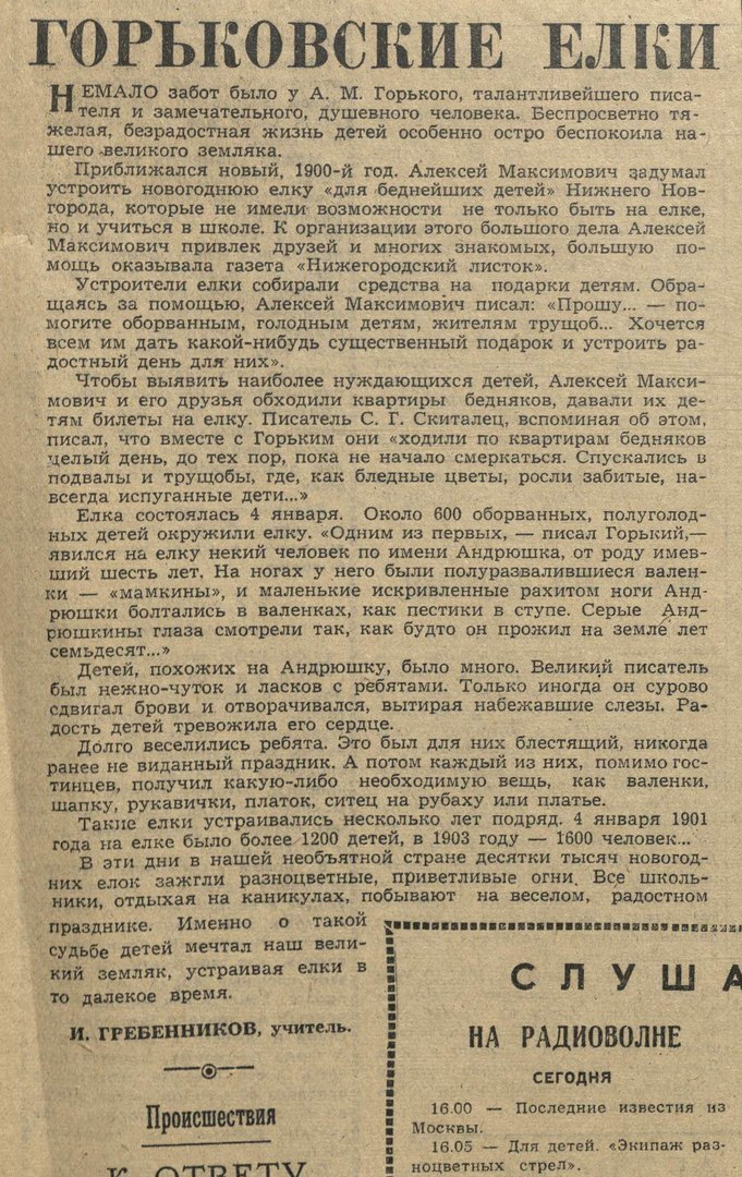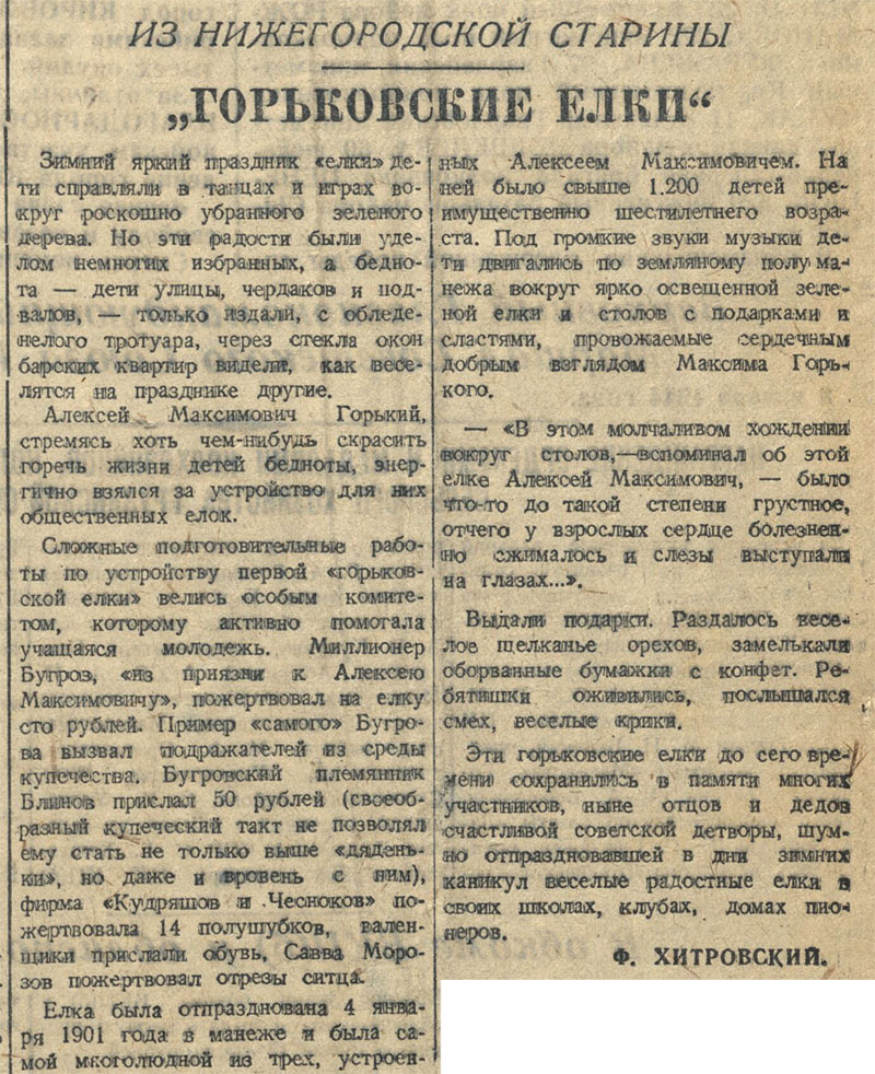 … «Помимо устройства катка для детей бедняков, о чем я говорил выше, Алексей Максимович устраивал в эти годы в Нижнем Новгороде знаменитые «елки» для детей из трущоб, организуя веселые праздники и зрелища для ребят, никогда не видавших и не знавших развлечений, и оделяя их подарками, башмаками, рубашками и штанами, а также книжками, сластями и едой.