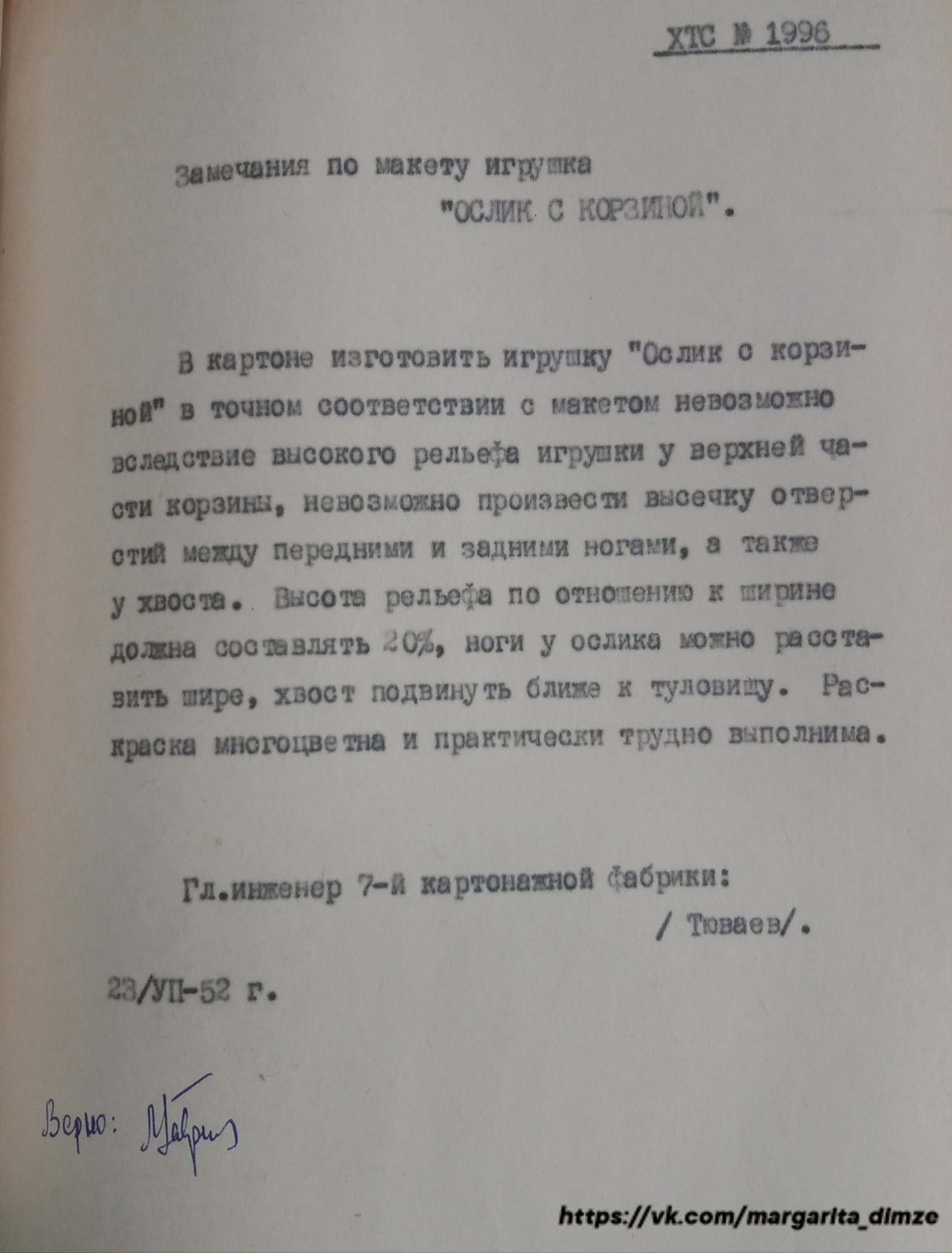 В 1952 году Картонаж: Ослик, Лебедь, Козлик, Баран, Цирковая лошадка, Рыбка.