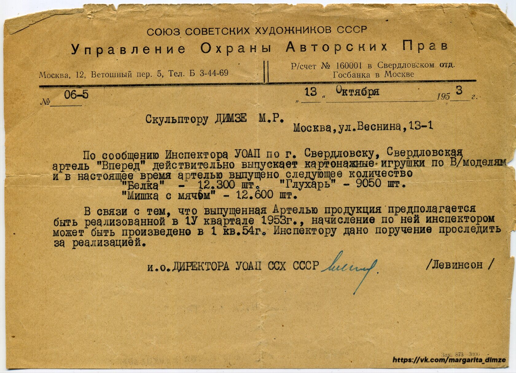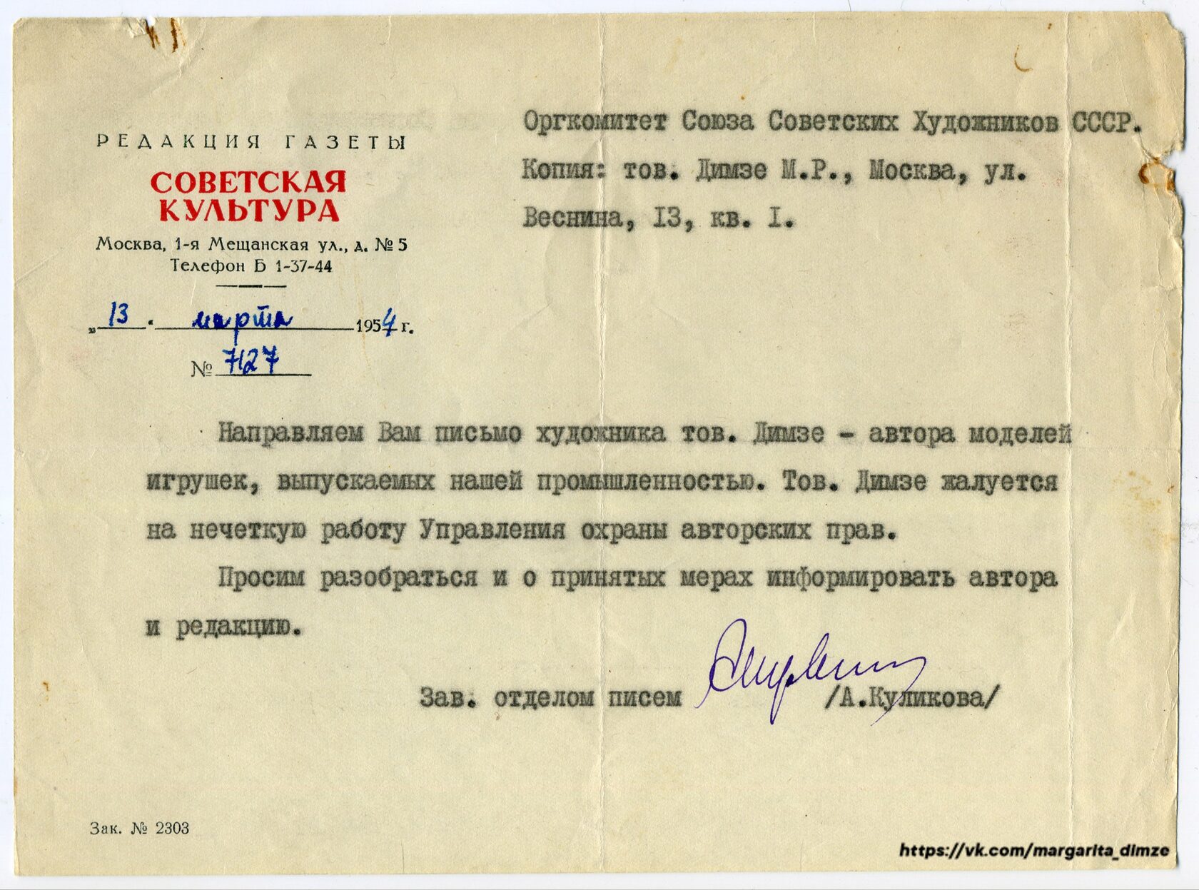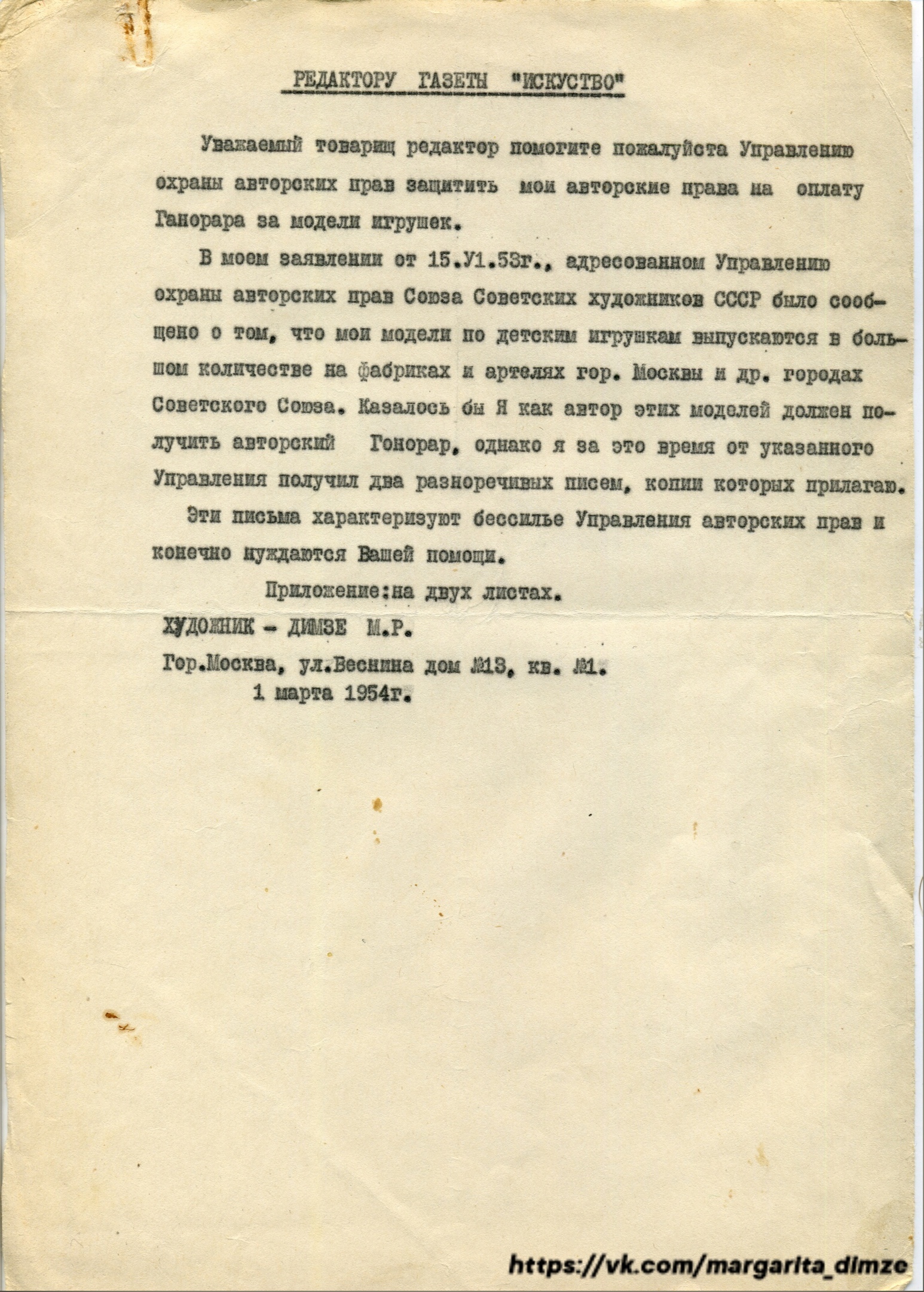 Однако, на протяжении 1953 и 1954 годов у Маргариты Димзе возникают трудности из-за неоплаты артелями процента за авторство, предусмотренного Законом тех времен. Ниже вы можете ознакомиться с документами, подтверждающее это. Смогла ли она отстоять свои права не известно.